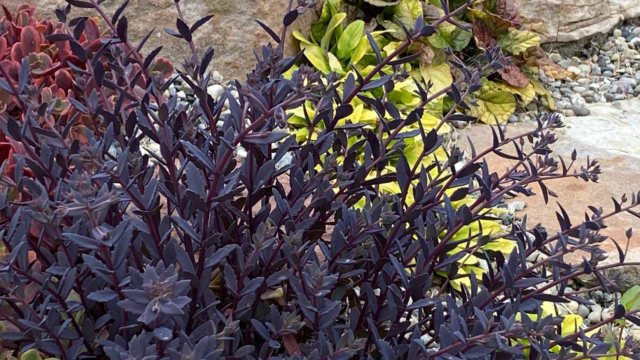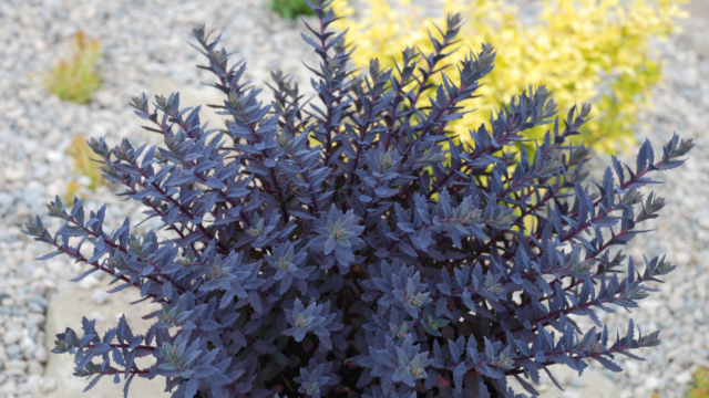 SunSparkler® sedum Sapphire Tuffetppaf has dark smokey-blue leaves with thin 1/2″ serrated edges. In early Summer this ultra-hardy sedum almost looks like a purple boxwood! Sapphire Tuffetppaf  grows 10-12″ tall and gets a riot of hot pink flowers in the Fall!